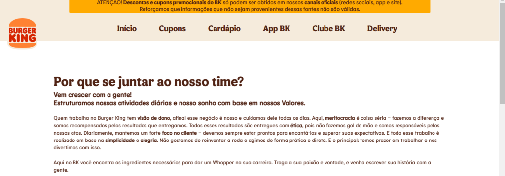 Na página oficial de Carreiras, o Burger King destaca valores como meritocracia, ética, foco no cliente, simplicidade e alegria. A empresa reforça que “quem trabalha no Burger King tem visão de dono” e é recompensado pelos resultados entregues.